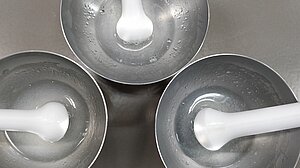 Ansätze über 200 mL sollen mit einem elektrischen Stabmixer angefertigt werden, da die Anreibung von Hand mit zunehmender Ansatzgröße aufwendiger wird und das Risiko der Entstehung von Pulveragglomeraten steigt. Die Suspension kann dann im Ein-Topf-Ansatz in einem Becherglas hergestellt werden: die Feststoffe und die Grundlage für Suspensionen zum Einnehmen können nacheinander und ohne zwischenzeitlichen Mischvorgang in das Becherglas gegeben und dann gemixt werden. In der NRF-Vorschrift ist das Vorgehen im Abschnitt „Herstellungstechnik und Abfüllung“ beschrieben.